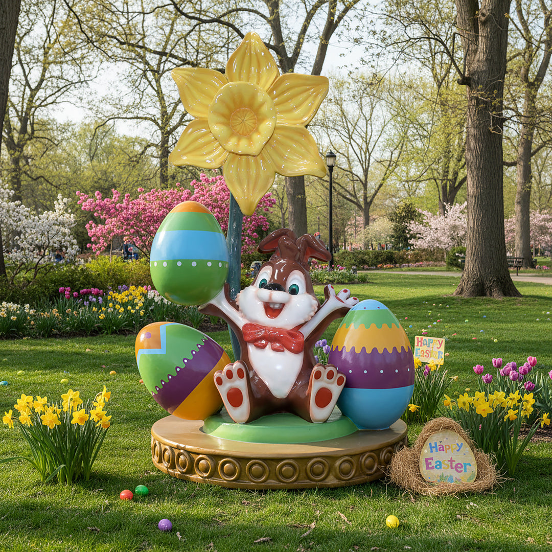 Brighten any Easter installation with this show-stopping 7.6ft Easter Flower with Bunny display. A glossy oversized flower rises above a cheerful bunny figure surrounded by vibrant eggs, creating a playful spring scene that draws attention. Designed as a premium centerpiece.