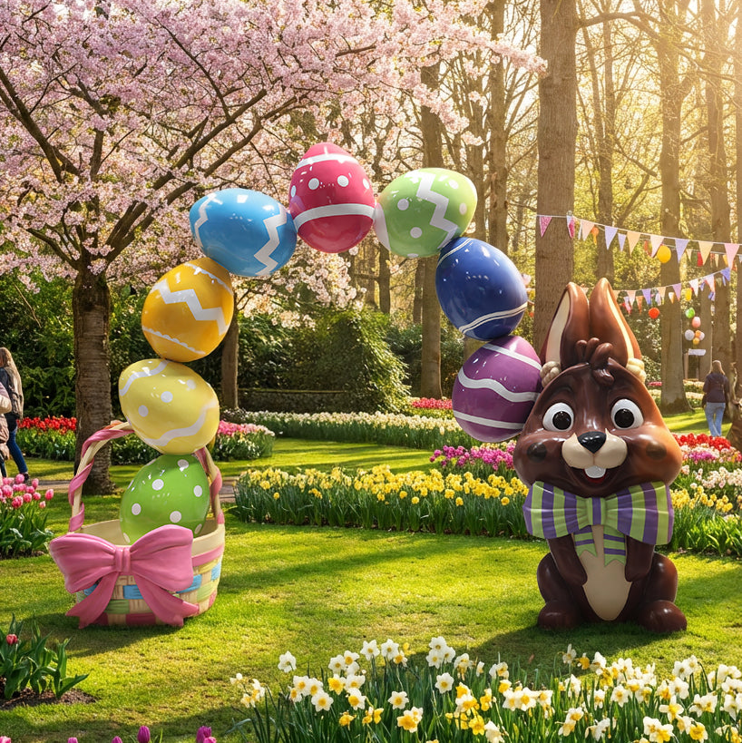 Bring springtime cheer to your space with this eye-catching 7ft tall Easter display. Featuring a glossy oversized flower centerpiece, an adorable bunny figure, and vibrant, hand-painted Easter eggs, it creates an instant photo spot and a welcoming seasonal focal point.