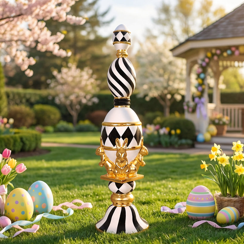 Make a bold seasonal statement with this 6.5ft Bunny Finial, designed as a striking Easter centerpiece. Featuring elegant black-and-white patterns, gold accents, and playful bunny detailing, it adds height, style, and a premium photo-ready touch to any spring display.